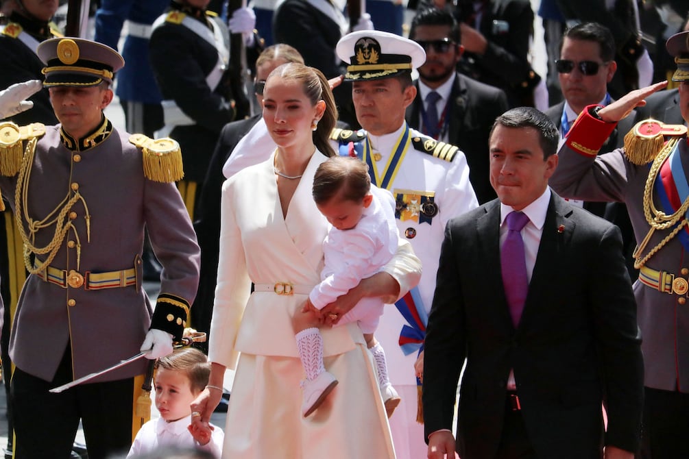 El presidente Daniel Noboa Azín y su familia llegaron a la sede de la Asamblea Nacional para la ceremonia de posesión del periodo 2025-2029, de blanco ellos y de negro él, en una demostración de sobriedad.