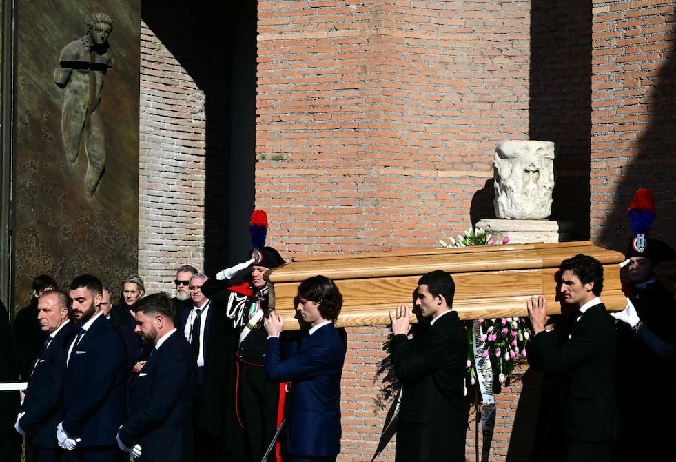 La basílica de Santa María de los Ángeles y los Mártires de Roma estaba decorada con coronas de rosas blancas, y frente al altar había una gran fotografía del diseñador, fallecido el lunes a los 93 años.
