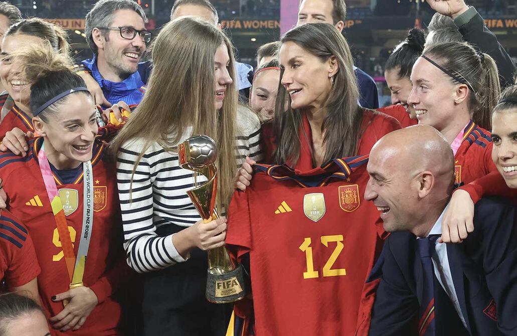 La reina Letizia ya tiene su camiseta con el número 12 dentro de la selección española de fútbol, una colorida prenda que hacía juego con su imponente traje rojo de Hugo Boss inspirado en la moda masculina y seleccionado especialmente para esta ocasión.