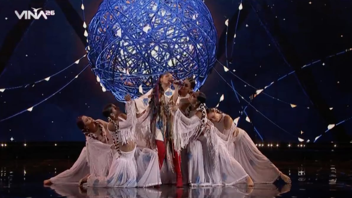 Con una propuesta similar a la de su debut, la artista ecuatoriana presentó una puesta en escena marcada por una coreografía vibrante, acompañada por seis bailarinas vestidas de blanco y dos guitarristas en vivo. Sobre el escenario se desplazó con seguridad, manteniendo la identidad visual que la caracteriza. Su vestuario, compuesto por un vestido blanco y medias rojas, se integró a la estética general del espectáculo.