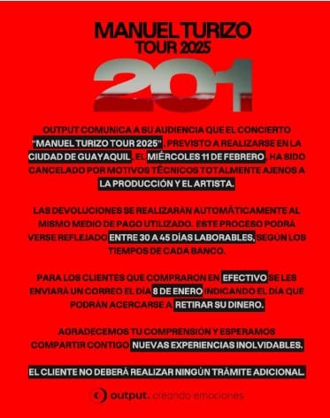 El concierto de Manuel Turizo en Guayaquil, previsto para el próximo 11 de febrero en el coliseo Voltaire Paladines Polo, fue cancelado por motivos técnicos, según informó la empresa organizadora Output. Mediante un comunicado en la página oficial, la productora aclaró que las causas son totalmente ajenas al artista y el equipo de producción.