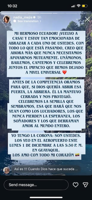 Al cierre de su mensaje, incluyó un agradecimiento directo al país:“Yo tengo la corona: son ustedes.” El aviso generó expectativa entre sus seguidores, quienes ya organizan su llegada a Guayaquil para recibirla este lunes. (E)