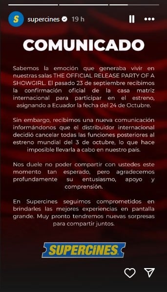 En Ecuador, cadenas locales habían previsto una función para el 23 de octubre, fuera del calendario global. Sin embargo, esa proyección fue cancelada y no llegará a la cartelera nacional. Para el público local, la experiencia queda limitada al formato digital y a la compra de ediciones físicas importadas en CD, casete y vinilo.