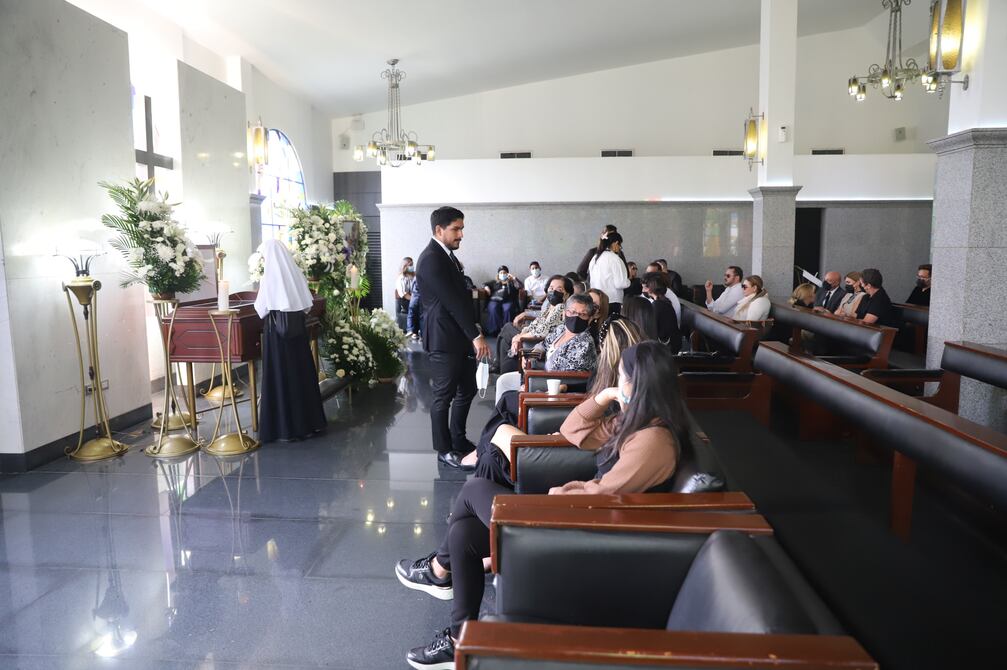 Ramos de rosas blancas escoltaban el féretro café en el que descansaban los restos del presentador de televisión Miguel Cedeño, en la sala exclusiva #3 de la sala de velaciones de Guayaquil.