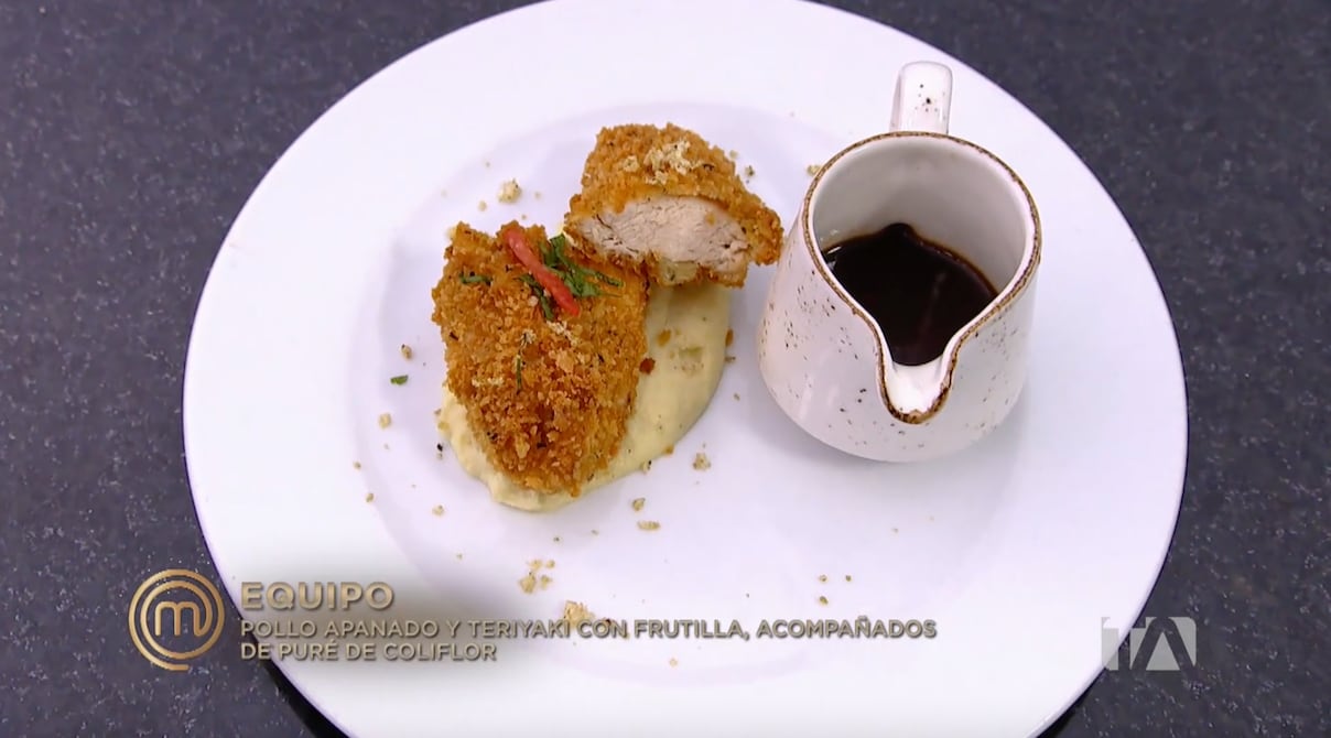 El siguiente fue el gris con un pollo apanado y teriyaki con frutilla, acompañados de puré con coliflor. Este plato fue elogiado por los chefs.