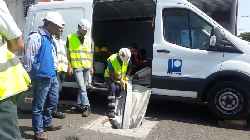 Una larga manga de poliéster era desenrollada e ingresada de una furgoneta hacia un ducto de alcantarillado. La meta era ir de una esquina hacia otra, en la calle 16 y primer callejón Francisco Segura, suburbio oeste.