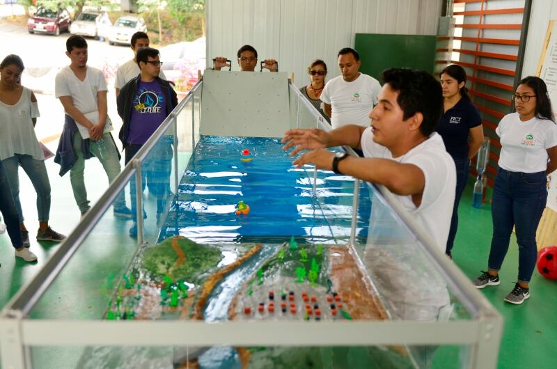 Jefferson Cárdenas, estudiante de Ingeniería Oceanográfica en la Espol, explicaba que un tsunami se genera a partir de un terremoto en aguas abiertas, de la rotura de la corteza oceánica. Y acompañaba su exposición recreando el fuerte oleaje en un estanque rectangular que a más de agua tenía barcos pequeños y un paisaje costero.