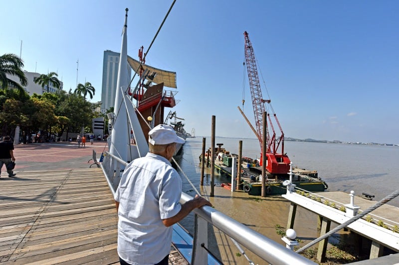 Una grúa instalada sobre una gabarra, en el río Guayas, marcó el inicio de las tareas de hincado de pilotes para la ampliación del muelle del Yacht Club, en el Malecón Simón Bolívar, en la intersección con la calle Clemente Ballén.