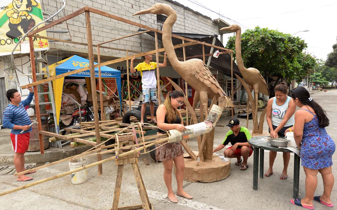 Unos vecinos pegan con agilidad el papel, otros mezclan la goma, mientras tanto Carlos León Muñoz va dando forma a un monigote de una garza para el que se usa como base madera; el ave símbolo de Samborondón es uno de los elementos del trabajo con el que participan en el Concurso de Años Viejos 2018, que realiza el Municipio de Samborondón.