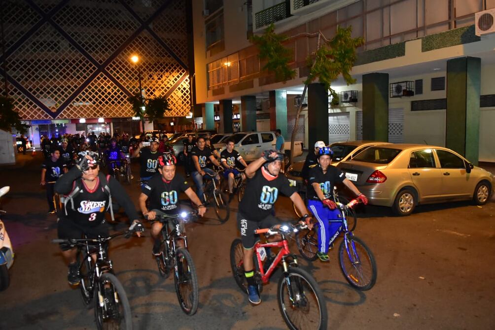 Camisetas con la frase '60, Hora del Planeta' usaron un grupo de ciclistas que recorrieron esta noche varias calles del centro de Guayaquil, por la conmemoración de la Hora del Planeta.