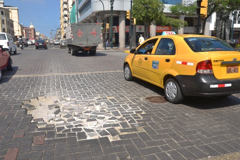 Alrededor de una veintena de adoquines permanecen dañados o están descolocados desde hace varios días en la esquina de la avenida Machala y 9 de Octubre, en el centro.