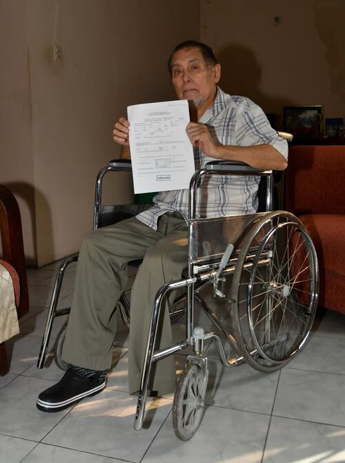 Las manos le tiemblan a Julio César Calero Garcés cuando se aferra a los tubos de su silla de ruedas en el momento previo a impulsarse para bajar del artefacto. Se sienta al filo de la escalera que une a la planta alta con la vía pública. Respira, fija su mirada en el escalón siguiente y empieza su descenso de una treintena de peldaños.