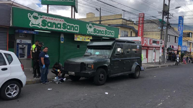 Manchas de sangre y algunos casquillos fue lo que quedó de un intento de robo ocurrido al mediodía del viernes en el sector de Carcelén, en el norte de Quito, donde cuatro personas resultaron heridas.