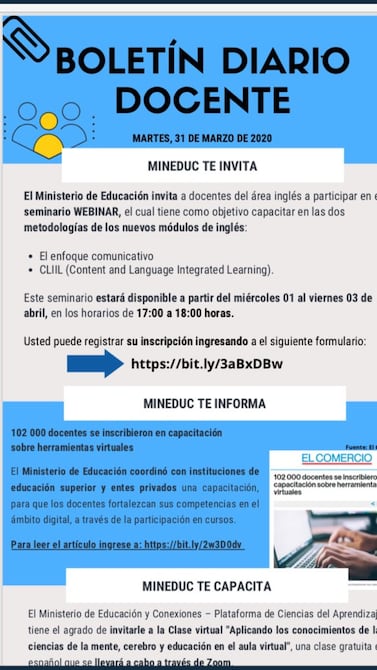 Desde hoy hasta este viernes, de 17:00 a 18:00, estará disponible el seminario Webinar dirigido a docentes del área de inglés, gestionado por el Ministerio de Esducación.