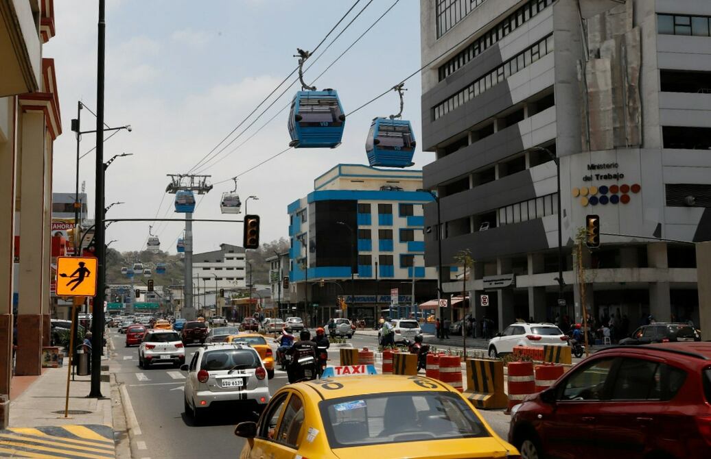 En el centro de Guayaquil, el desplazamiento de las cabinas del sistema Aerovía sobre un tramo de la avenida Quito no pasa desapercibido para cientos de transeúntes, que registran la escena inédita en sus teléfonos celulares.