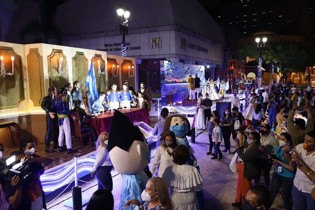 Seis carrozas alegóricas que representan las obras del bicentenario de la independencia guayaquileña son exhibidas desde la noche de este jueves 1 en la plaza de la Administración, junto al Palacio Municipal, en el centro de Guayaquil.