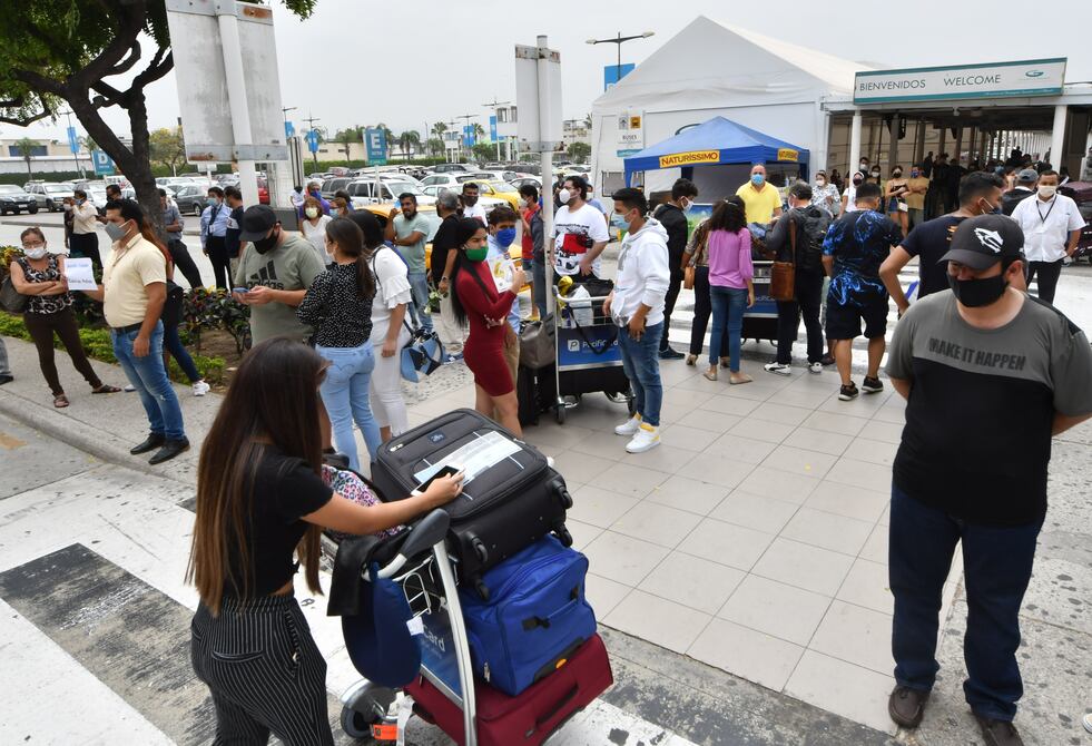 Jéssica Holguín llegó a las 12:15 de ayer a ver a su novio al aeropuerto José Joaquín de Olmedo de Guayaquil. Ella era una de las más de 30 personas que esperaban en las carpas instaladas en el parqueadero de la terminal aérea, a fin de evitar aglomeraciones para que haya circulación de aire y mitigar casos de COVID-19 en medio de la emergencia sanitaria.