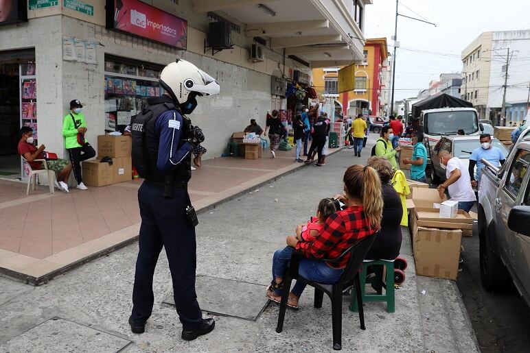 Los agentes de la Policía Metropolitana que ejercían control del espacio público en las calles Cacique Álvarez y Ayacucho, en la Bahía de Guayaquil, centro, solicitaban reiteradamente a vendedores informales que no se tomaran las veredas.