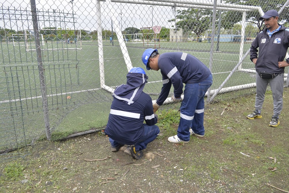 Personal técnico de Parques EP se desplegó en el área de las 12 canchas del Parque Samanes que fueron cerradas de forma preventiva tras la muerte del formador de fútbol, Juan Garcés, la semana anterior.