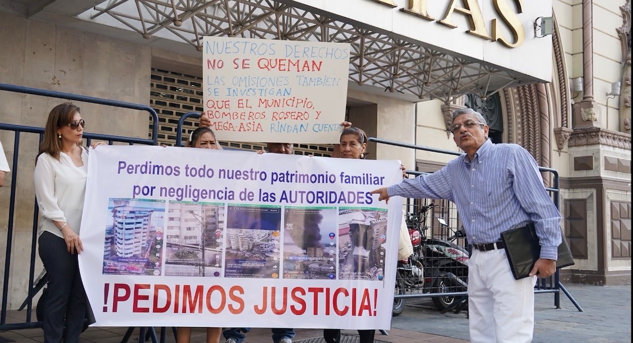 Con carteles y consignas, copropietarios del centro comercial Multicomercio se concentraron la mañana de este lunes en los exteriores de la Fiscalía de La Merced, donde acudieron a rendir sus versiones dentro del proceso por el incendio.