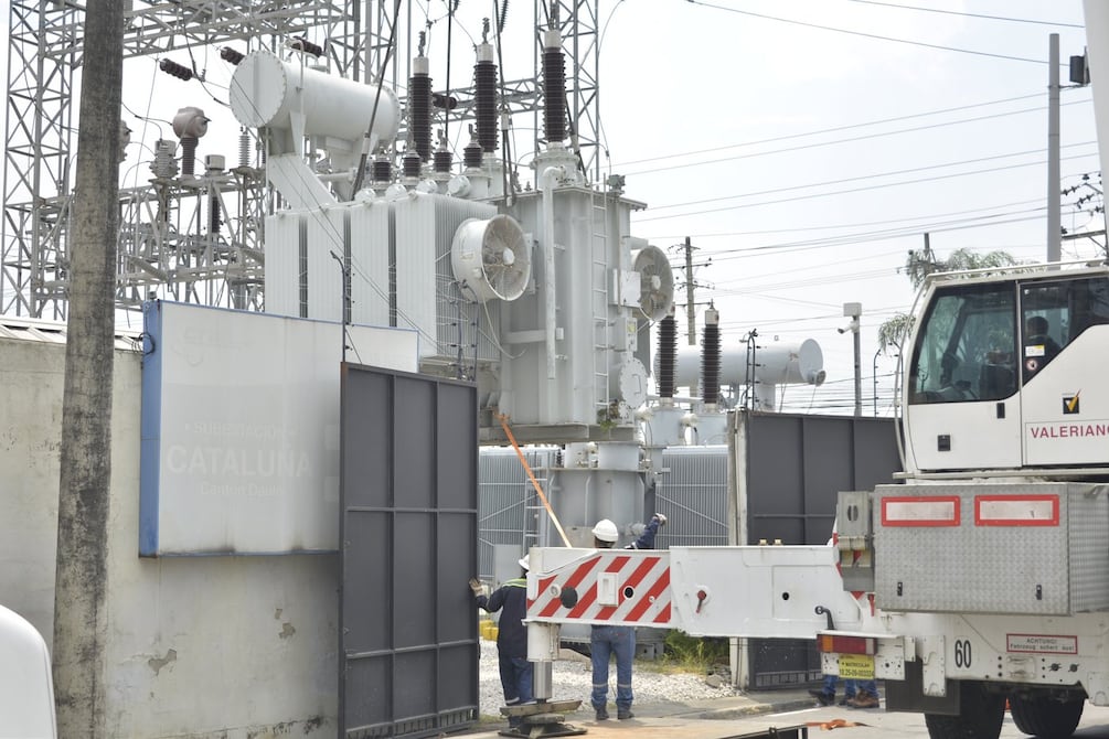 Personal de la Corporación Nacional de Electricidad (CNEL) realizó maniobras con el apoyo de una grúa para instalar un nuevo transformador de potencia en la subestación Cataluña, instalada junto a la urbanización del mismo nombre, en La Aurora.
