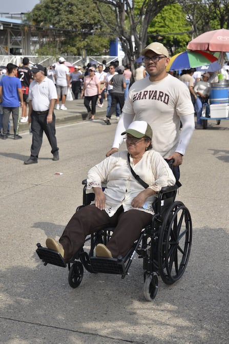 Con una mano sostenía la sombrilla y con la otra empujaba la silla de ruedas en la que ella avanzaba entre los fieles.