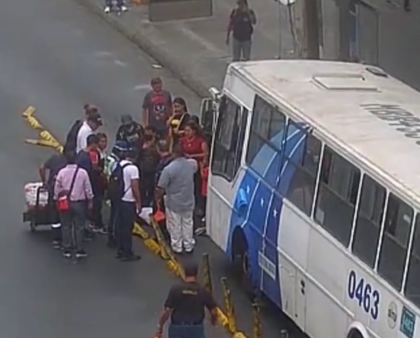 Un bus que circula por 10 de Agosto y Seis de Marzo, en el centro de Guayaquil, detiene la marcha en media calle. De la unidad se baja una mujer que no se da cuenta de que otro bus se aproxima por el carril derecho.