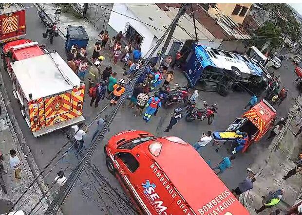 Una unidad de transporte público se volcó la mañana de este jueves en el norte de Guayaquil.
