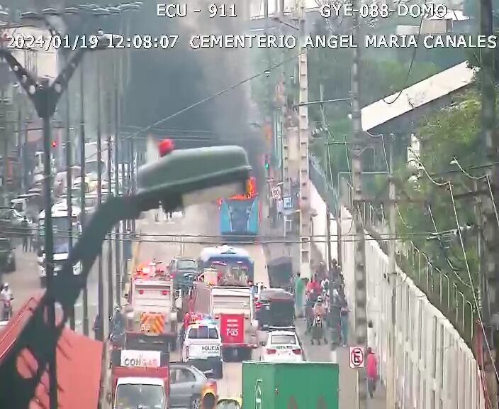 Un bus urbano se incendió al mediodía de este viernes, 19 de enero, en las calles 29 y la J, cerca del cementerio Ángel María Canals, suburbio de Guayaquil.