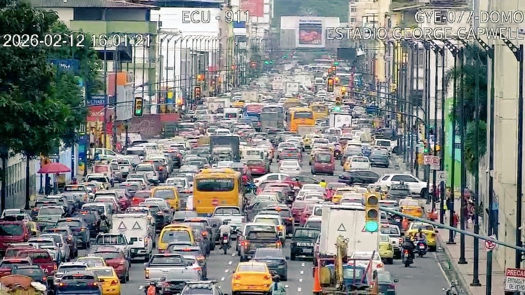 La tarde de este jueves se registró intenso congestionamiento vehicular en el centro de Guayaquil debido a cierres aplicados por una manifestación y por las restricciones vigentes en el perímetro del incendio estructural del edificio Multicentro.