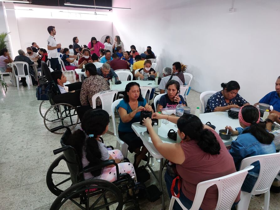 Gregorio, de 69 años, junto con su nieto, paciente con parálisis cerebral infantil (PCI) de 8 años, fueron parte del grupo que recibió almuerzos la tarde de este miércoles, 16 de agosto, en el comedor de la Casa Rosada, ubicada en la ciudadela Atarazana, en el norte de Guayaquil.
