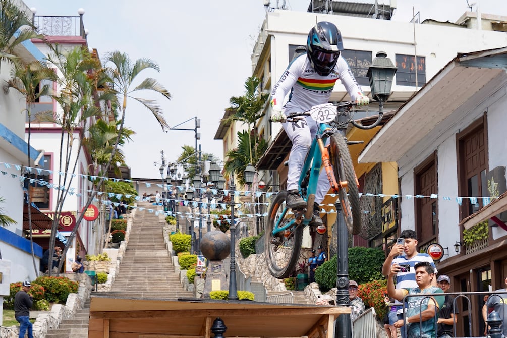 Una fila personas se agrupó en los alrededores de la rampa en la parte final del recorrido en las escalinatas de Las Peñas, donde decenas de ciclistas llegarán en la competencia Downhill del Cerro Santa Ana.