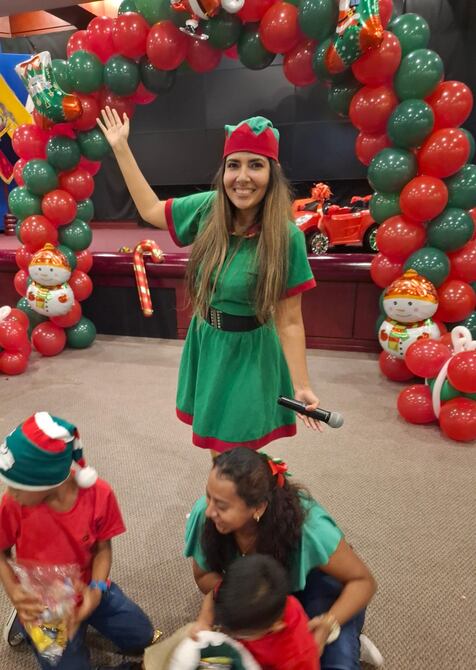 Con un vestido verde con filo rojo, un gorro largo y sus zapatos verdes en punta hacia arriba y con cascabeles. Así sale Katiuska Andrade a animar a cientos de niños en estas fiestas de Navidad que se realizan en el Puerto Principal.