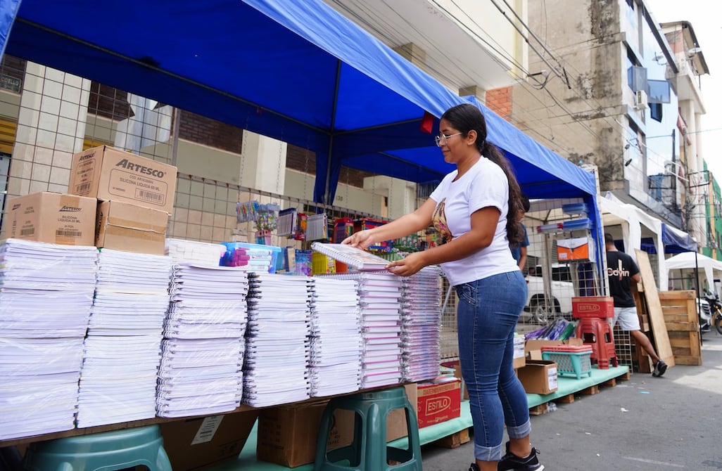 En una de las carpas, Gardenia Portilla acomodaba paquetes de útiles mientras revisa listas escolares que le sirven de referencia para armar combos.