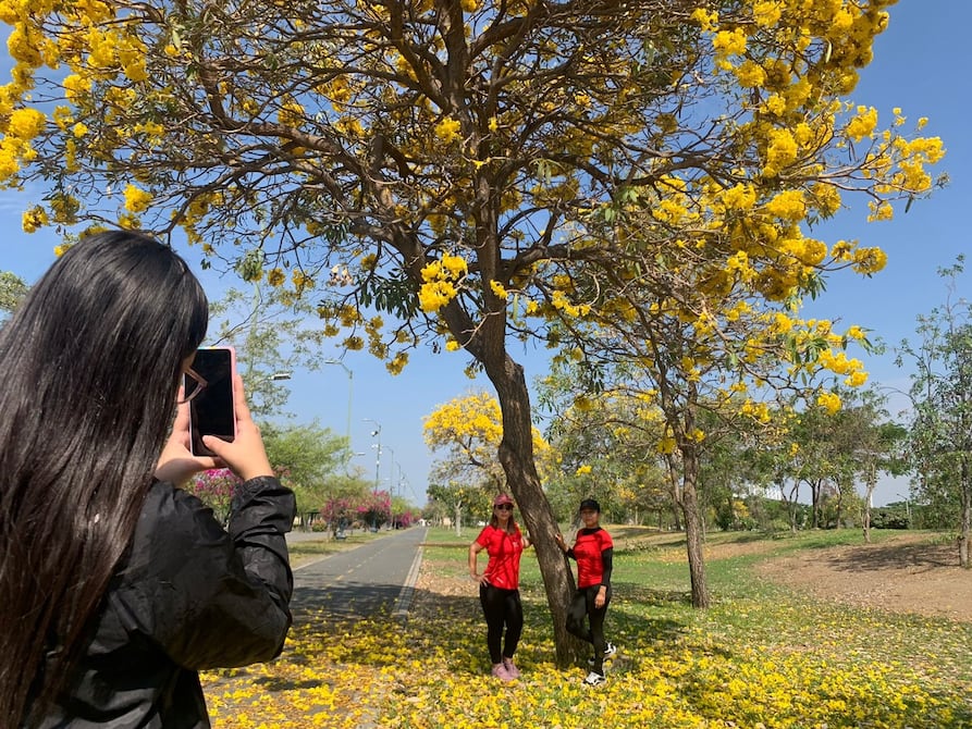 Verónica Echeverría, Carmen Solís y Valeria Carrión acabaron sus clases de zumba la mañana de este viernes y se dedicaron a recorrer los guayacanes y bototillos que pintaron de amarillo varias zonas del parque Samanes, en el norte de Guayaquil.
