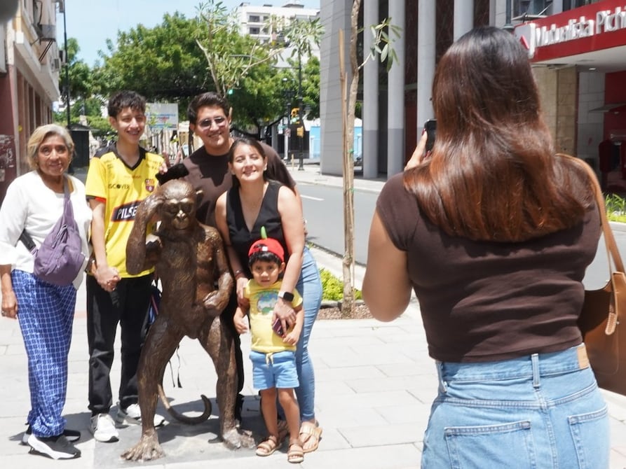 En la esquina de Pichincha e Illingworth, el paso de la gente no se detiene, pero sí cambia por segundos cuando alguien fija la mirada en el mono de bronce colocado a un lado de la acera, donde por su tamaño, más bajo que una persona adulta, queda a la altura de las manos y permite que el contacto sea directo, sin barreras ni distancia.