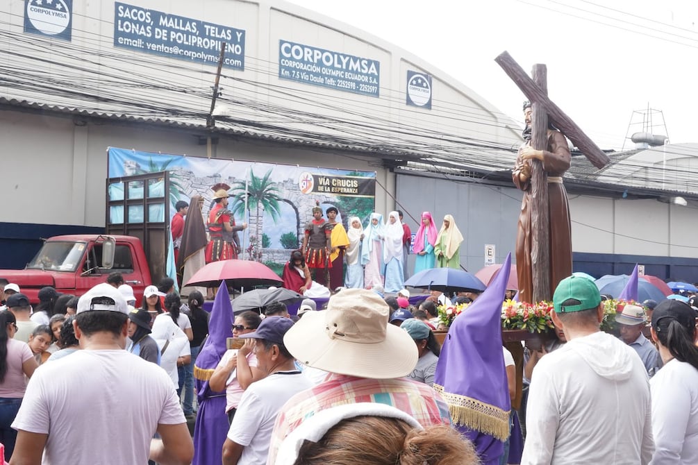 El padre Eduardo Méndez, de la parroquia Ángel de la Guarda, explicó que el viacrucis de la Esperanza tiene una trayectoria de 34 años y reúne a fieles del noreste de la ciudad, como Prosperina, Juan Montalvo, entre otras localidades.