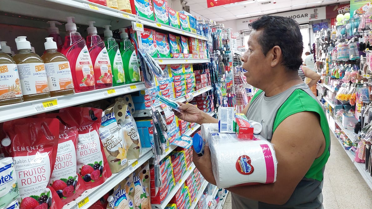 Jacinto Reyes cargaba fundas de papel higiénico, una pasta dental y jabones en las manos en un supermercado de las calles 17 y Portete, en el suroeste de Guayaquil, la mañana de este sábado, 20 de septiembre.