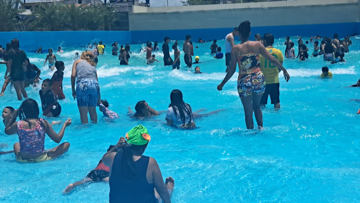 El inclemente sol hizo que Marlene Suntaxi y su pequeño hijo tomaran su terno de baño y sandalias para dirigirse a la piscina de olas municipal ubicada en el Batallón del Suburbio.