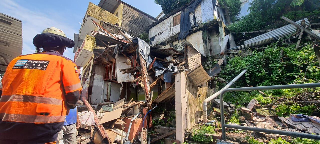 Un inmueble de dos pisos de construcción mixta ubicado en el sector de cerro Santa Ana, centro de Guayaquil, colapsó la tarde de este miércoles, 22 de febrero.