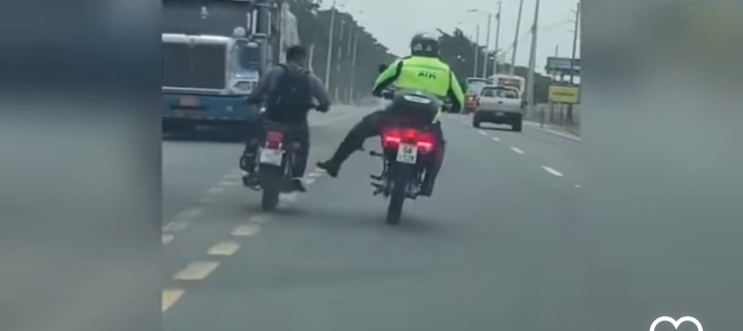 Un agente de tránsito persigue a un motociclista que va sin casco por la vía a Daule. En medio de la persecución, el agente estira una pierna para empujar y someter al motociclista que de manera riesgosa se acerca al carril contrario.