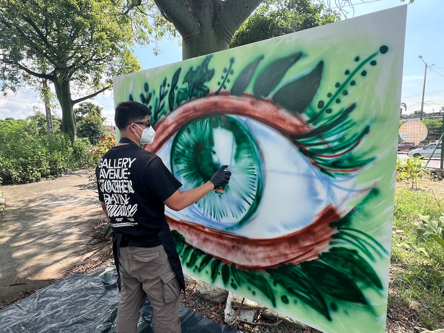 A pocos metros, Marlon Barzola, artista plástico y diseñador oriundo del sur de Guayaquil, trabajaba en una figura central: un gran ojo rodeado de elementos naturales.