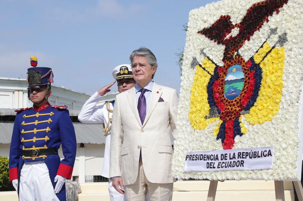Vestido de traje claro, el presidente Guillermo Lasso acudió la mañana de este lunes 25 a la plaza Colón para rendir homenaje a Guayaquil.