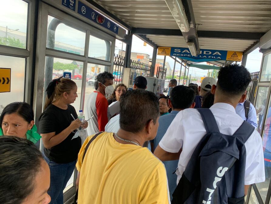 Decenas de estudiantes estaban apretujados en medio de los pasajeros a la espera de un articulado en la parada Sopeña, en el sur de Guayaquil.