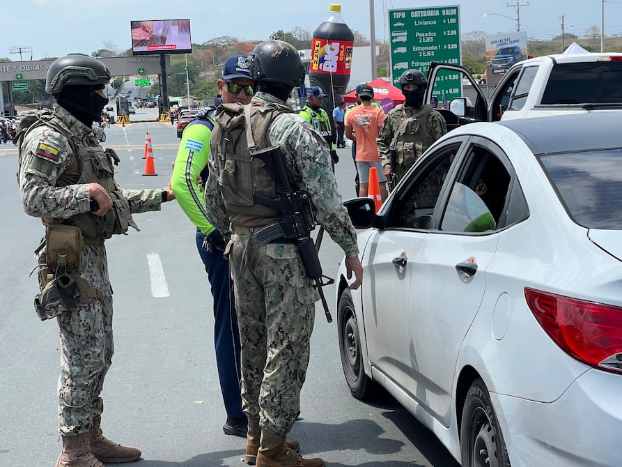 Una veintena de militares se ubicó junto con agentes de la Comisión de Tránsito del Ecuador (CTE) y de la Agencia de Tránsito y Movilidad (ATM) para los operativos de control que se realizan este miércoles, 1 de enero de 2025, en el peaje de la vía a la costa.