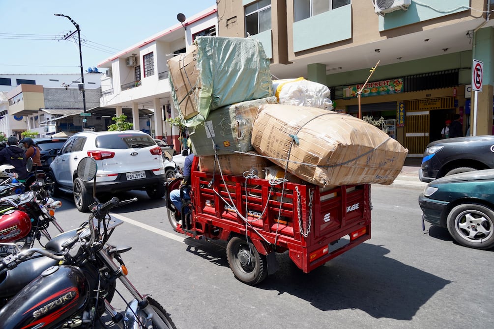 El semáforo reflejaba la luz roja la mañana de este jueves, 19 de diciembre, para que los vehículos que iban por la calle 10 de Agosto se detengan, sin embargo, eso no importó a una mujer que iba en una tricimoto eléctrica con dos menores en la parte posterior.