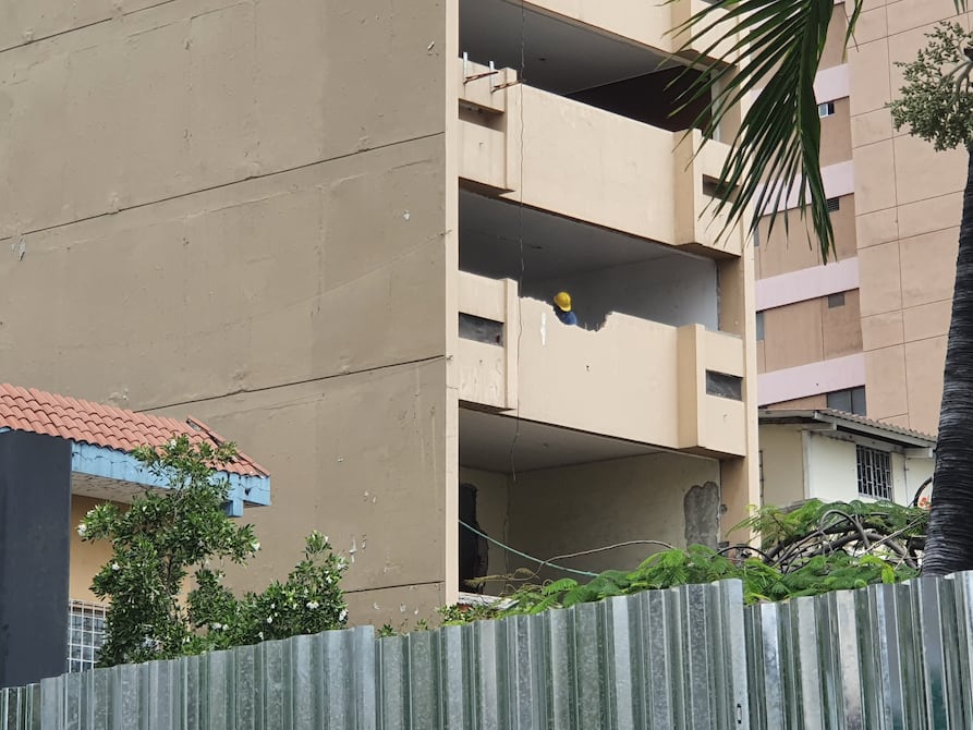 Cuadrillas de obreros intervienen en los primeros pisos del edificio Fantasía, para mitigar el avanzado proceso de inclinación.