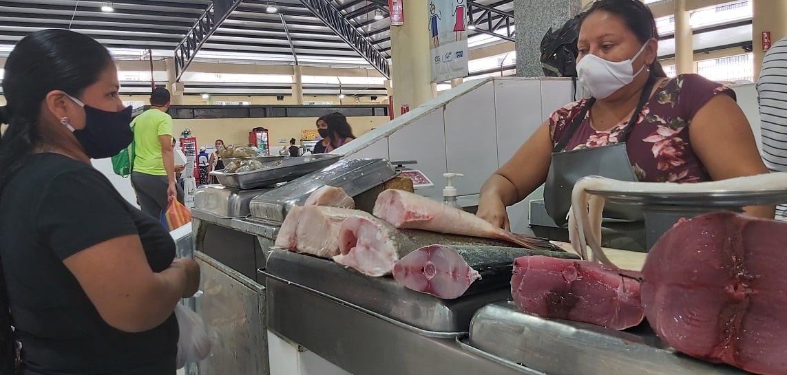 En el puesto de mariscos de Angelina Sáenz, en el mercado Central, situado en el centro de Guayaquil, había camarón, calamar, albacora, corvina y dorado. Rosario, quien vive en el suburbio y que dijo que había llegado a la zona para realizar un trámite, preguntó el costo de la libra de esta última especie de pescado. Le dijeron “tres dólares” y siguió recorriendo locales.