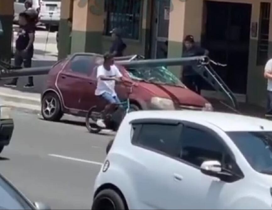 Un poste metálico cayó sobre un carro estacionado en la avenida Machala y calle Pedro Pablo Gómez, en el sector del mercado artesanal. La estructura dañó el techo del vehículo y los parabrisas delantero y trasero.