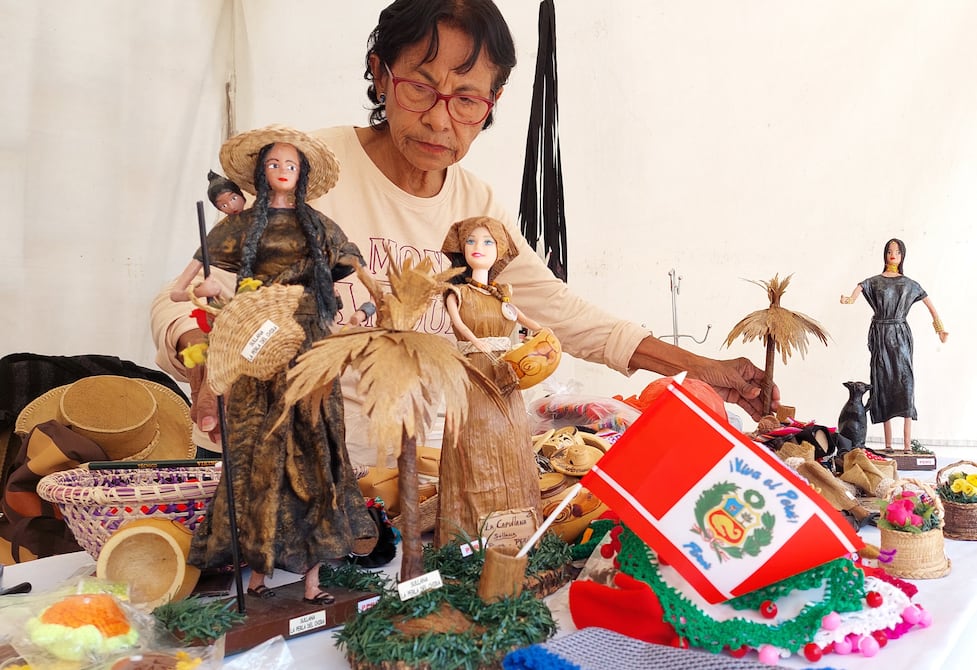 Dorali Atoche Flores, proveniente de Sullana (Perú), instaló monederos, pulseras, y figuras de personajes prehispánicos y otros souvenirs sobre una mesa a fin de exponerlas a los visitantes que llegaron al estreno del evento Ecua-Perú Fest. que se realiza desde este jueves hasta el fin de semana.